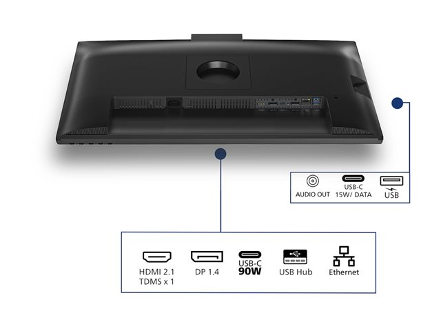 | Gränssnitt | HDMI (HDCP 1.4, HDCP 2.2) DisplayPort 1.4 (HDCP 1.4, HDCP 2.2) DisplayPort-utmatning LAN (RJ-45) USB-C uppström (DisplayPort alt-läge, ström upp till 90 W) 3 x USB 3.2 Gen 1 nedströms (Typ A) USB 3.2 Gen 1 nedströms (snabbladdning BC 1.2) Linjeutgång för ljud (minijack) |