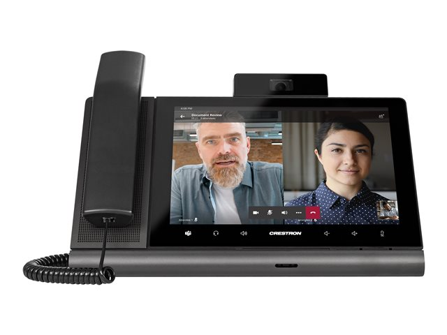 The Crestron Flex UC-P10-T-C-HS-I desk phone provides a premium video collaboration solution for use with the Microsoft Teams intelligent communications platform. It offers Full HD quality video and audio calling, capability to view and zoom the shared content, and full-duplex hands-free speakerphone capability in an elegant desktop design. It features a large 10 in. color touchscreen display, built-in Full HD camera with privacy shutter, hearing aid compatible handset, and wired or Bluetooth enabled headset support. The phone can be synced with a Microsoft Teams account, with contacts, schedules, voice mails, and other preference settings appearing on the phone's touchscreen.
