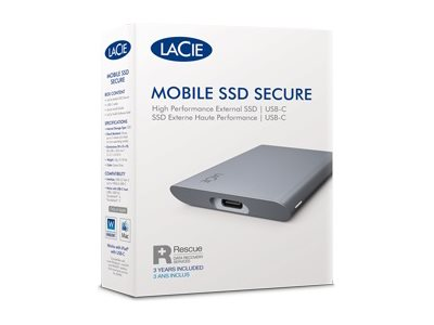 LaCie Mobile Secure STKH1000800 - SSD - High Performance - krypterat - 1 TB - extern (portabel) - USB 3.2 Gen 2 (USB-C kontakt) - 256 bitars AES - rymdgrå - med 3 års Seagate Rescue Data Recovery