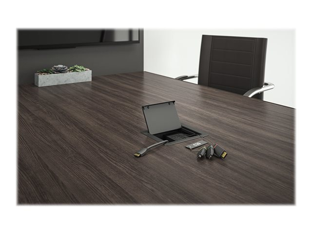 The Retractable Table Box Mount 4K HDMI Adapter Ring is the perfect addition to conference rooms, huddle spaces, lecture halls or classrooms to make sure that anyone can connect. The standard configuration includes the adapters to connect nearly any device to the in-room display, while supporting up to a 4K video resolution. Standard configuration includes HDMI to DisplayPort, Mini DisplayPort, or USB-C adapters to meet connectivity challenges.