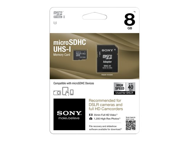 Utöka kapaciteten i din smartphone med ett microSD High Speed på 8 GB från Sony! Perfekt för smartphones och surfplattor. Kostnadsfri File Rescue-programvara, återställer även 3D-filer. Optimal tillförlitlighet. Ultimata prestanda tack vare skrivhastighet i klass 10 och läshastighet på upp till 40 MB/s!