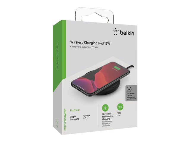 Belkin BoostCharge - Trådlös laddningsplatta + växelströmsadapter - 15 Watt - QC 3.0 - svart WIA002VFBK