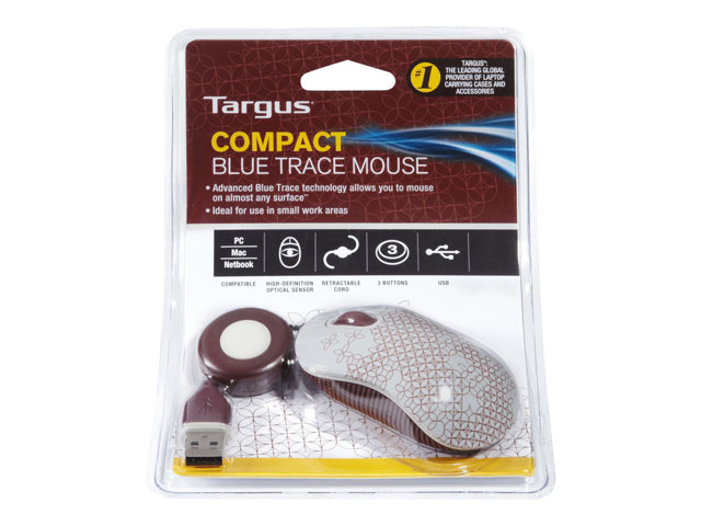 The Targus Compact BlueTrace Mouse with a stylish and contemporary design is the perfect solution for travelers who need to save space when using an external mouse. The integrated scroll button allows you to scroll up or down through spreadsheets or browse the internet. The Blue Trace technology combines the power of an optical mouse with the precision of a laser mouse for remarkable tracking on almost any surface.
