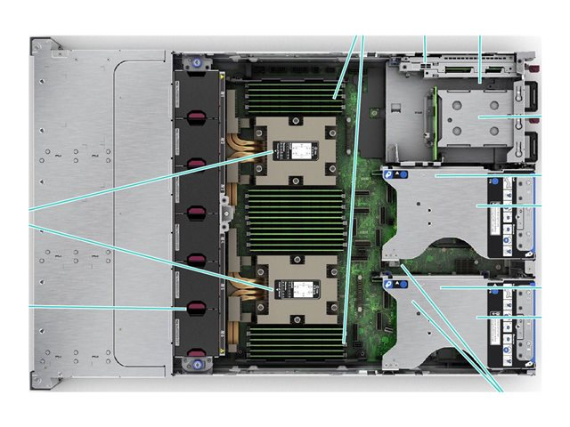 | Gränssnitt | 1 x HPE iLO (1 på framsidan) (service port) 5 x USB 3.2 Gen 1 (1 fram, 2 bak, 2 interna) 1 x VGA 4 x LAN (Gigabit Ethernet) |