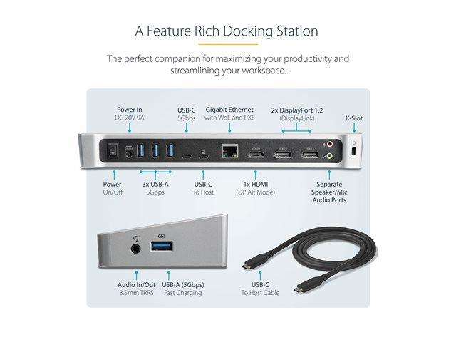 | Gränssnitt | 3 x SuperSpeed USB 3.0 - 9-stifts USB typ A 2 x USB-C - 24 pin USB-C 1 x bildskärm / video - HDMI - 19-stifts HDMI typ A 2 x bildskärm / video - DisplayPort - 20-stifts DisplayPort 1 x nätverk - 10Base-T/100Base-TX/1000Base-T - RJ-45 1 x hörlurar - minitelefon 3,5 mm, 4-poligt 1 x mikrofon - minitelefon 3,5 mm 1 x högtalare - minitelefon 3,5 mm 1 x SuperSpeed USB 3.0 with Fast Charging - 9-stifts USB typ A |