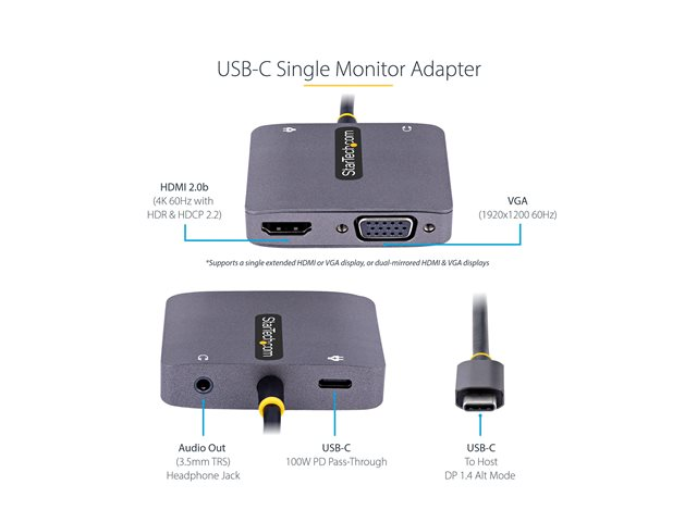 StarTech.com USB C Video Adapter, USB C to HDMI VGA Multiport Adapter w/ 3.5mm Audio Output, 4K 60Hz, HDR, 100W PD 3.0, USB C Monitor Adapter for Laptop, Thunderbolt 3/4 Compatible - USB C Display Travel Adapter (122-USBC-HDMI-4K-VGA) - Dockningsstation - USB-C / Thunderbolt 3 / Thunderbolt 4 - VGA, HDMI